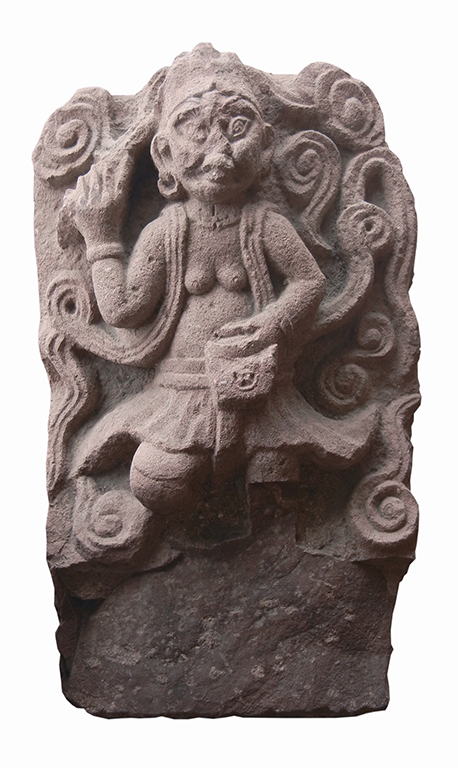 This very rare and interesting ancient Chinese stone statue shows a non Chinese figure possibly from a foreign country or from a tribe. The figure has pierced ears, and wears big loop earrings, bracelets, and necklace. Each hand appears to be holding an object. The top of the body is naked, draped over by ribbons. The figure wears a short skirt and, although broken on one knee, looks to be in a kneeing position. The sides of the figure are carved with more ribbons and cloud like motif. This piece possibly has come from the south-western China.