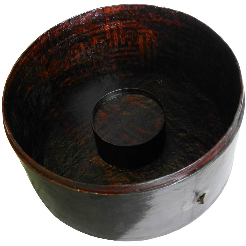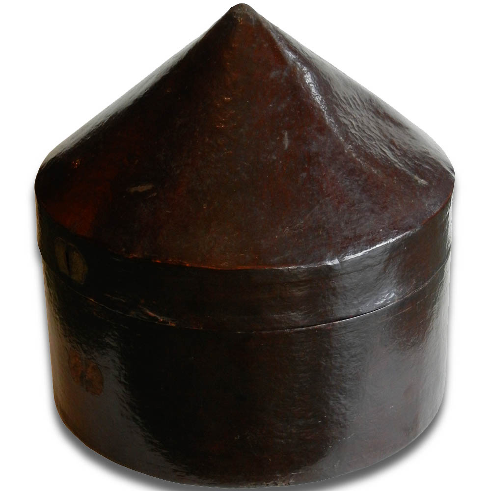 Unusual antique cow leather hatbox with rare inside red patterns; with pointed style lid. Good solid piece other than the outside leather loops were torn.