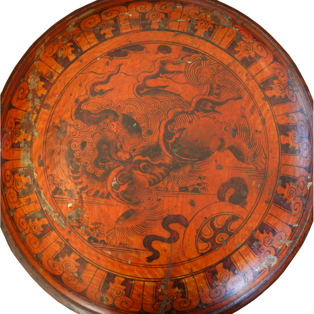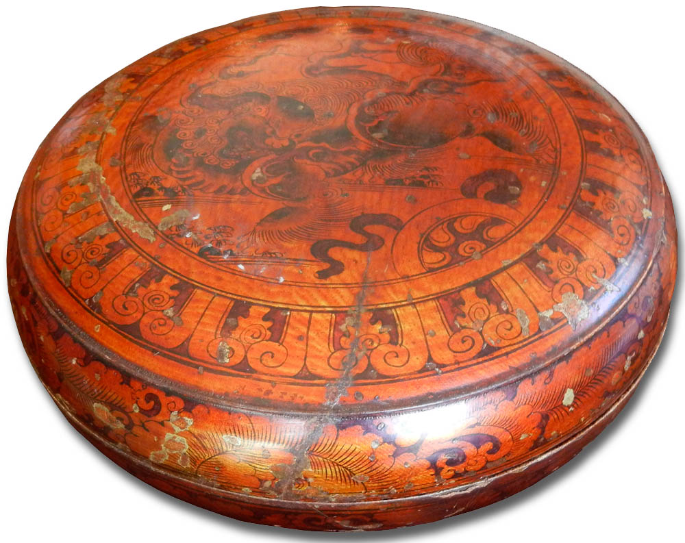 Antique gilt-painted Ju wood round box with original fine gilt painting of a Fu-lion moving with fire and a wheel, as-is.