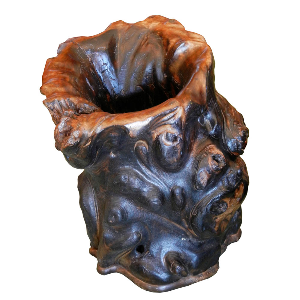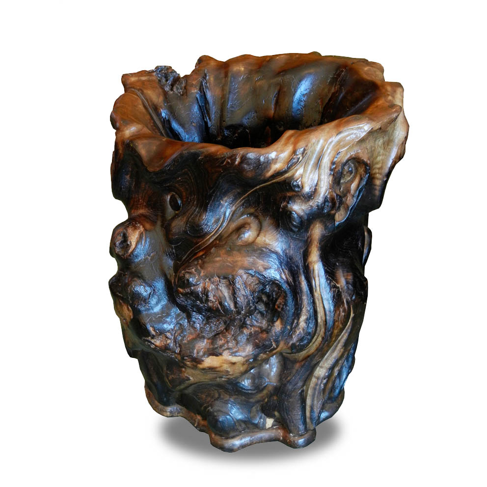 Large yellow boxwood tree root container. Refinished in darker color lacquer.