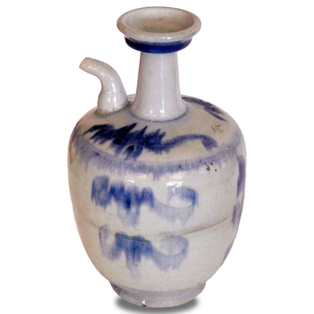 A 17-18th century antique Chinese wine ewer with dripped blue and white glaze.