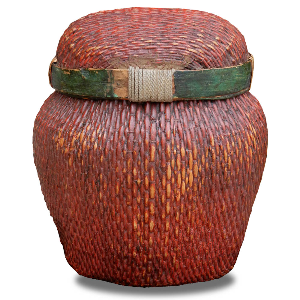 Antique medium size willow woven basket with original thick red lacquer, and green lacquer on the lid; late 19th-early 20th century. Repair on lid.