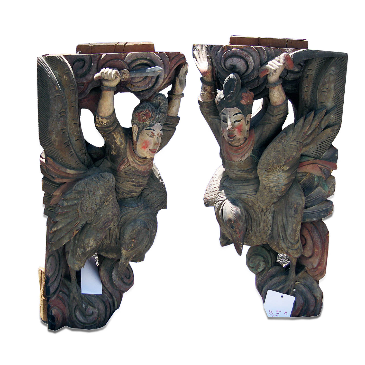Looking at the facial expressions of the two figures: The one on the right with eyes almost closed, looking down, with red cheeks smeared with rouge, wearing flowers on the hair, slightly smiling, with an expression of self content and confidence. The one on the left, equally at ease, looking forward down, with lips slightly open. Both figures were created with short and strong torso with powerful and stocky arms, lifting a weapon above the head. Such portrayal of female image is very contrary to the traditional view of female aesthetics shown in Chinese art in general except for those from the Tang Dynasty when women were shown to be more liberated. Each figure rides on a large bird, wonderfully carved in sculptural form, above the clouds, with equally plump and rounded body that wraps the figure with strong and thick extended wings. Together, in an almost festive mood, these two empowering figures represent themselves as female warriors or guardians.