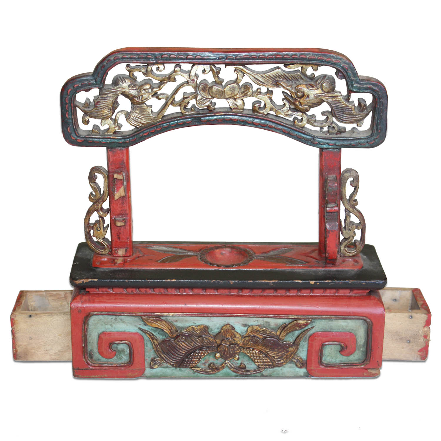 This intricately carved small antique chest is a bride's embroidery set for keeping the needles inside. The little round shape indented surface in the center above the drawer was used to contain a little water for helping to thread the silk through the needle. In ancient China, women were not encouraged to have schooling. A woman was very much judged in her skill in embroidery-it showed that she had proper upbringing.